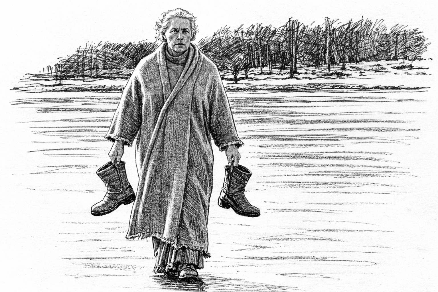 She stood there in those beat-up boots, laces knotted like some half-assed noose, shawl hanging off her shoulders the way a drunk hangs off a barstool—loose, tired, ready to slide off and die. Out ahead, the lake was frozen solid, a big, grey nothing staring back at her, the closest thing to forgiveness she’d ever