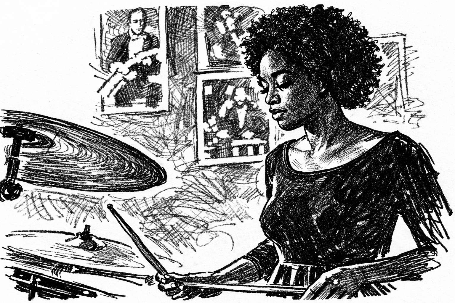 blow by blow, the drummer’s foot stomps that pedal like she’s kicking the world in the ribs, cymbals crashing silver in the dim, hi-hat chick-chick-chick in a wild solo to nowhere and everywhere. there she plays under the hot spotlight, the girl with brushes or sticks or her furious heart, beating it out, while the