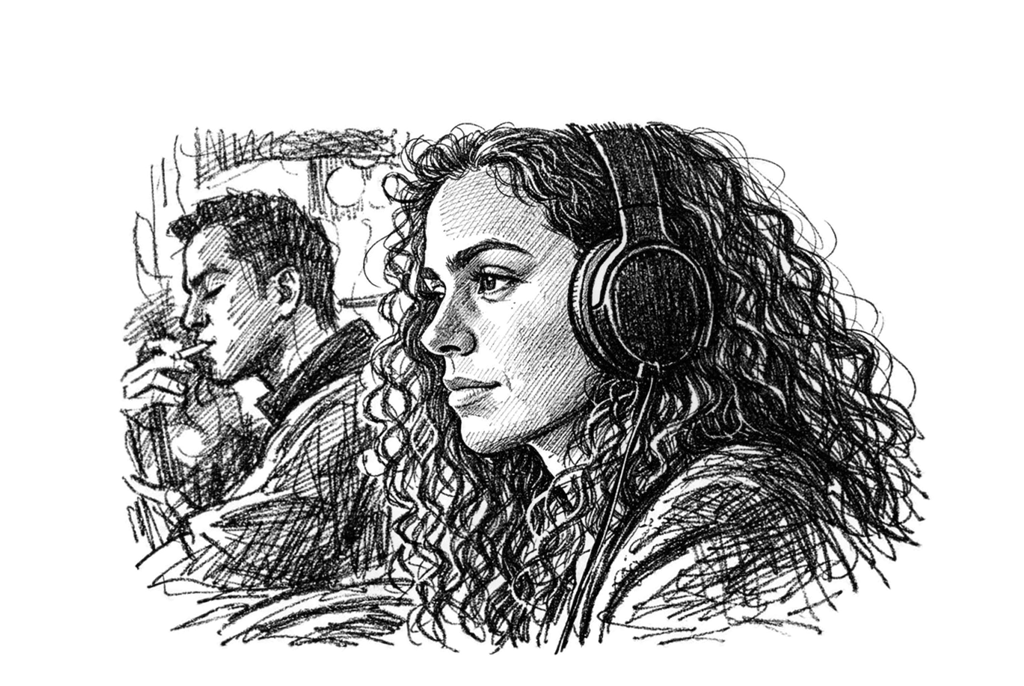 there I was, rattling along on through the grey English drizzle, the underground tube train clicking under my feet, when I spotted her across the aisle—dark hair falling wild, eyes like midnight streets—and I leaned over, heart beating that crazy beat, and asked if I could take a photo of her, just a quick one