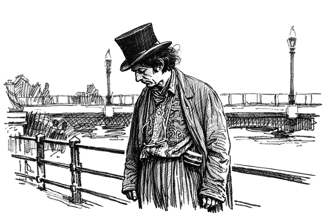 he dressed wild as a dream in those striped trousers flashing like railroad tracks under the sun, top hat bowler perched crazy on his head, long coat flapping in the wind off the river, gaudy shirt blooming colours like some mad flower in the grey city streets, eyeglasses swinging on a silver chain, clinking soft