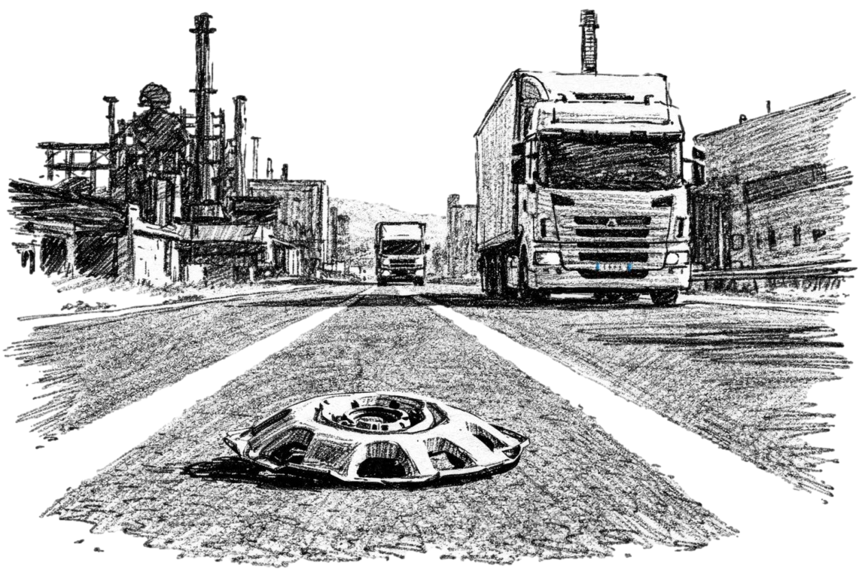the hubcaps — those gleaming silver nomads of the tar, holy rollers deserting me like faithless friends hitching rides to wilder horizons. they vanish into the luminous night or the blistering noon, tumbling free while I loop the same grimy industrial estate, the same sharp corners, unravelling slow like a bad dream I can’t shake.
