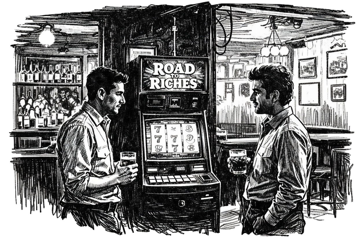 it’s closing time again and the “Road to Riches” machine is coughing up its last cheap mercy, some neon one-armed slot-machine in a Transvaal dive that smells of stale Castle Lager and broken dreams. You feed it coins like you feed a whore lies, and it shits back a plastic cup of rand coins, clatter-clatter-clatter,