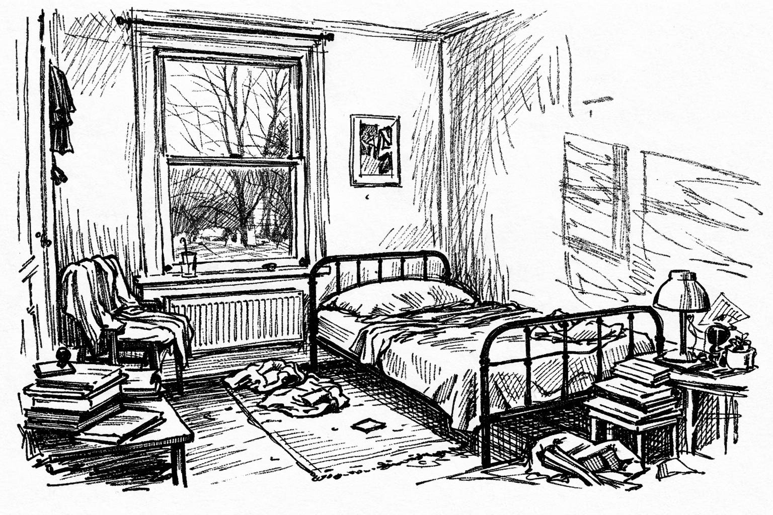 the room, this fucking dormitory cist, one bed like a slab they forgot to bury me in, two chairs that nobody sits on, and a corner window that stares out at nothing. solitude, the old whore, she climbs in bed with you every night, whispers the same tired shit in your ear until you almost