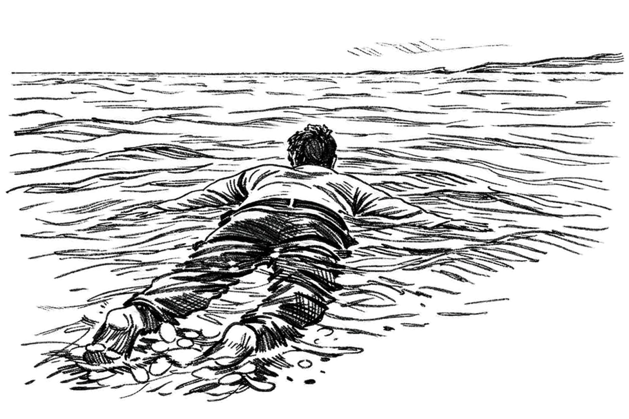 And there it was, the body, one single man’s body, broken like a sack of bones and meat dropped from heaven, floating quiet on the immense flatness of the sea, that big slow-breathing mother-ocean stretching out forever under the low grey sky, no ripple, no hurry, just the long swell lifting him and letting him down again, gentle as a drunk’s sigh.